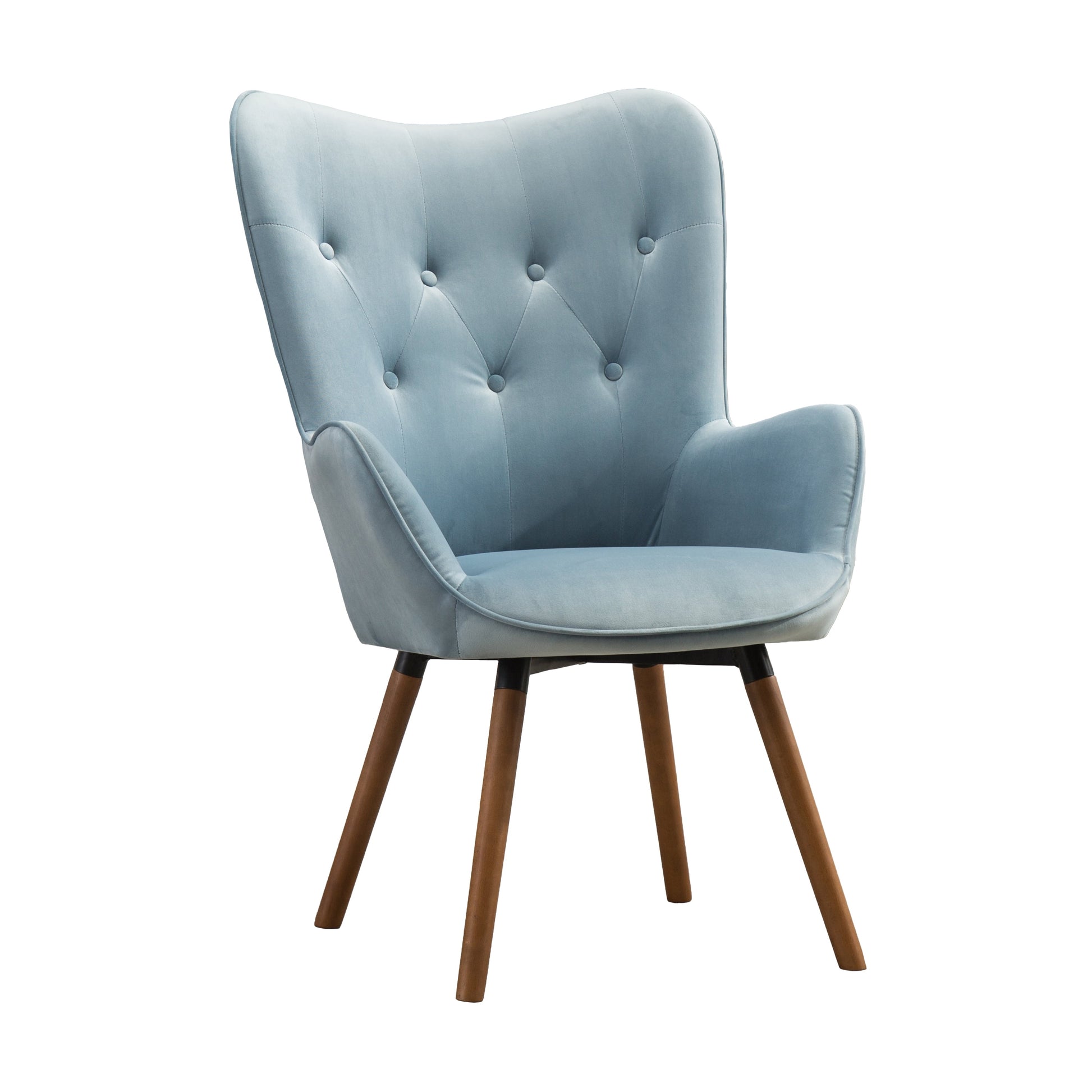 With soft foam, a solid wood leg, everything about this wingback style chair cries "well-crafted elegance." The chair features button-tufted accents and angled, round wood legs. Crafted with soft velvet fabric over a solid rubberwood frame and is offered in a choice of available colors. Perfect for a foyer, office, or accent piece, you can offer this chair to your guests with confidence. Comfortable, yet formal, this chair offers a smooth look of comfort and professionalism.