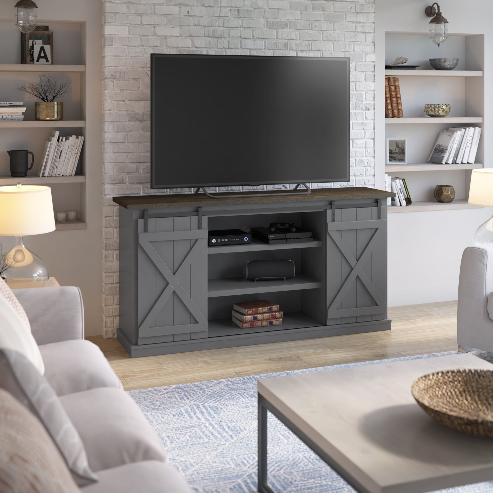 Enjoy modern farmhouse charm with this TV stand that holds most flat screen TVs up to 70 inches and 70 pounds ready for all of your family movie nights, big Sunday games, and streaming marathons. Real sliding barn doors offer a fun, rustic look and glide smoothly along metal rail hardware to open and close. The two side cabinets have two adjustable shelves each and the open, center shelf area has two adjustable shelves as well. The result is tons of storage space for cable boxes, DVRs, game consoles, other AV equipment, and even knick-knacks you love. Pass-through holes in the back panel manage cord routing to prevent tangles and add ventilation to cool electronics. If you’re looking to upgrade your entire living room, be sure to see the rest of the collection, including a matching accent cabinet, storage bench, and console table.